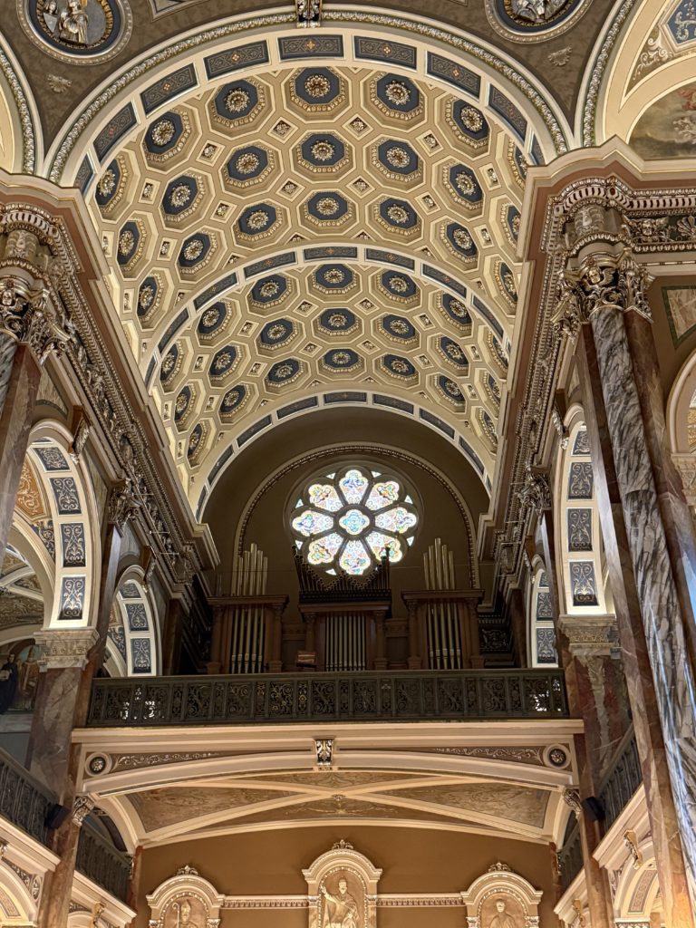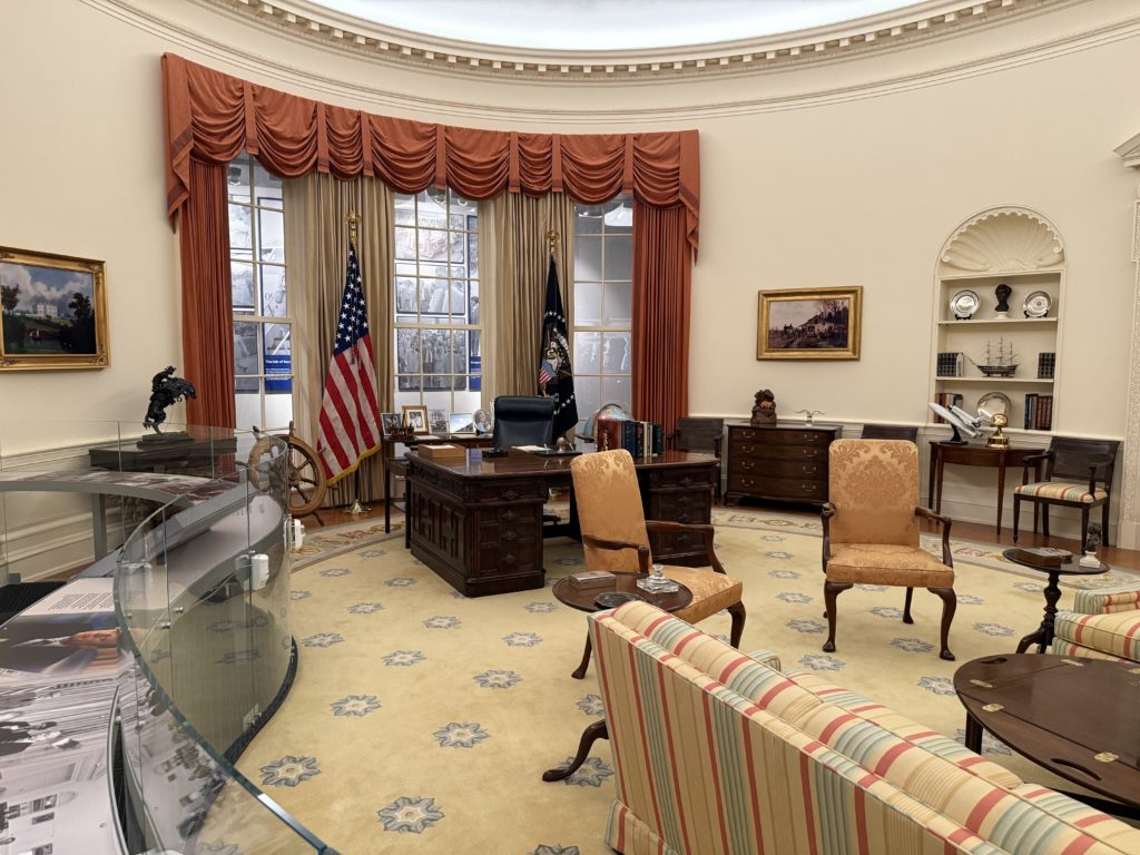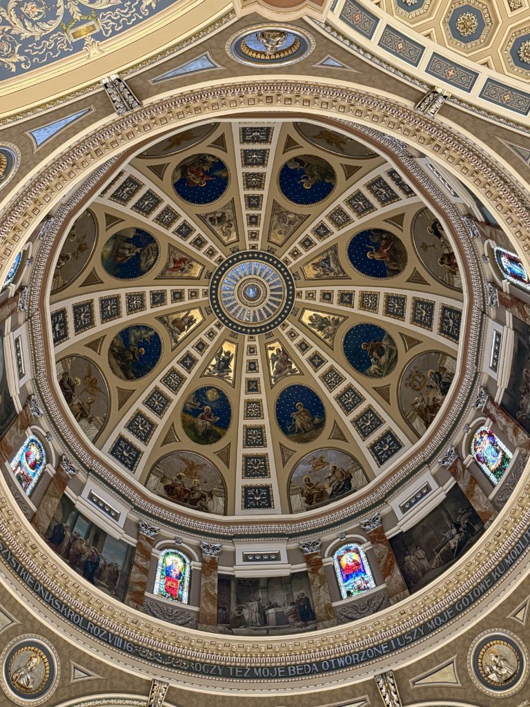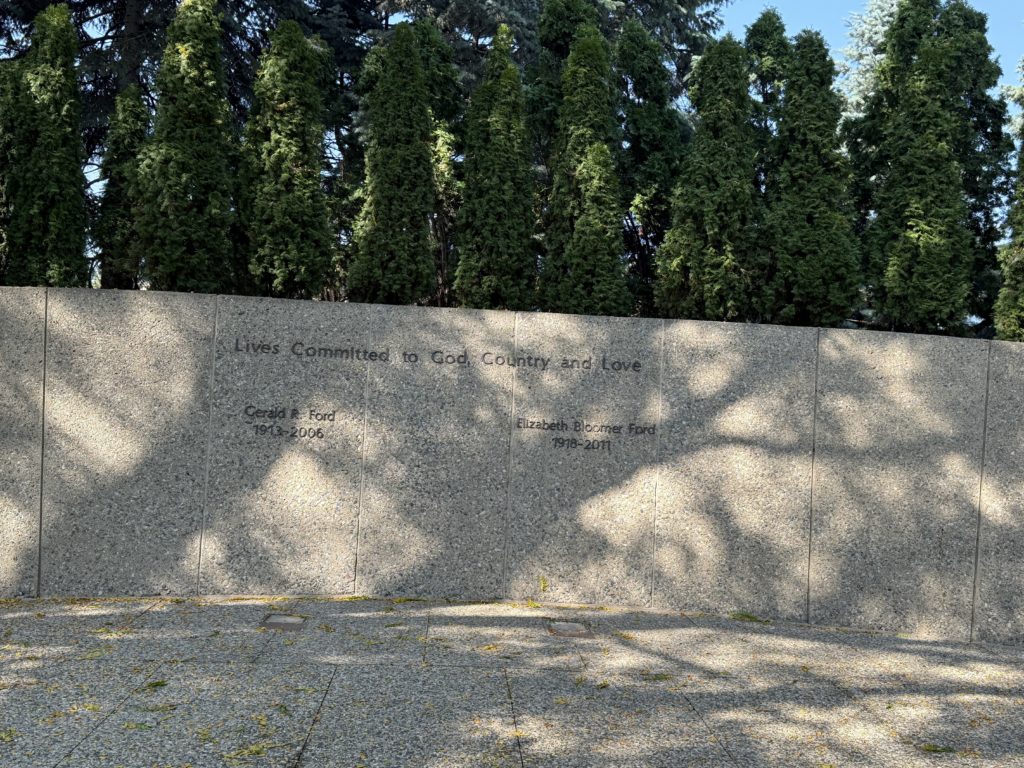 This is a statue of Gerald R. Ford outside his presidential library / museum. On the tour here we learned that Gerald Ford never really wanted to be president. When the presidency was thrust upon him at Nixon’s resignation, he accepted the presidency and was determined to serve with honor.This is another display outside of the Ford Presidential Library. Ford was a huge supporter of NASA and the space program.This is a hunk of the Berlin Wall, graffiti and all. Not sure why this is included in the Ford Library as the Berlin Wall didn’t come down until 1989, which was way after his presidency was over. But it is a cool display and close to my heart as I was stationed in Berlin while that wall was still standing.This is an exact replica of the Oval Office as it looked while President Ford was in office.This is an exact replica of the room where Ford held Cabinet meetings. Each person in the Cabinet had his assigned seat, as you can see by the labels on the table. Certain top level Press were allowed a seat at the table as well.And this is the final resting place for President Gerald R. Ford and First Lady Betty Ford. It’s on the grounds of the Presidential Library.Well, you know me and churches!! I just had to shoot a picture of the inside of this Catholic basilica, the Basilica of St. Adalbert. I am continually impressed with the beauty and detail of these places of worship.This is the dome of that same basilica. Just a view of downtown Grand Rapids. The river is the Grand River that flows through downtown.