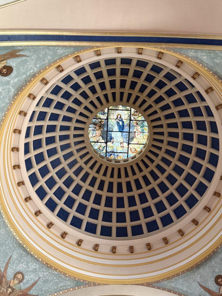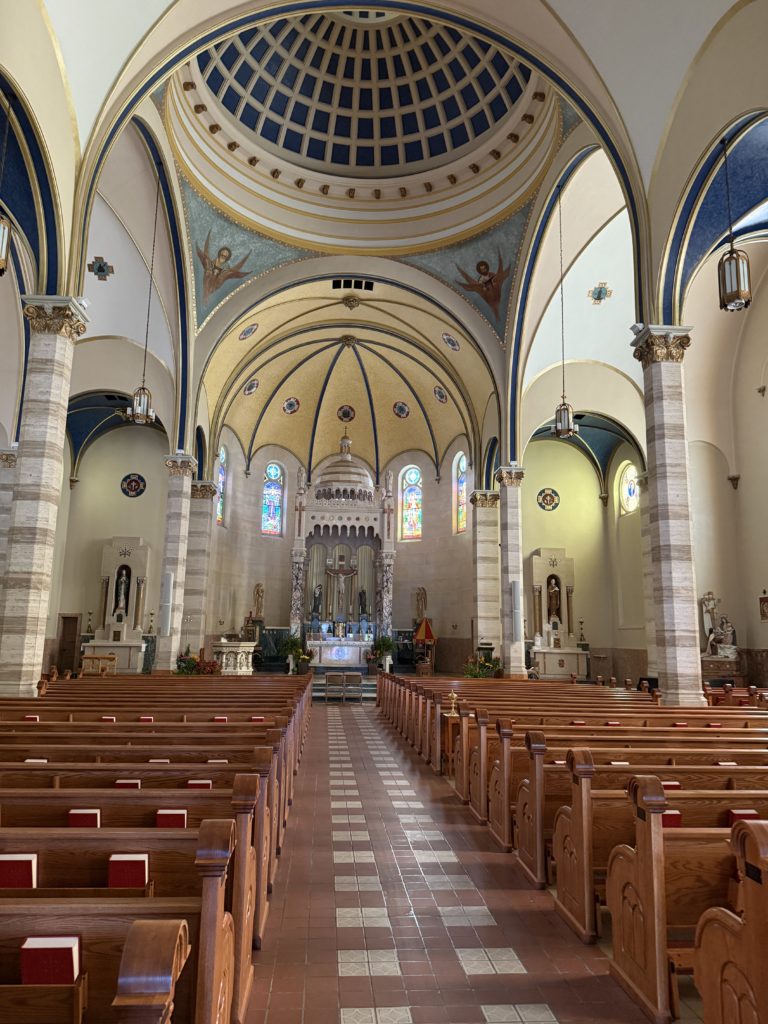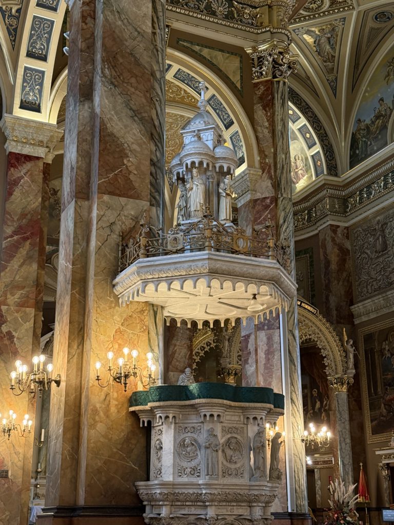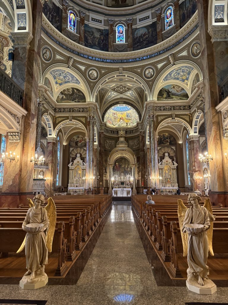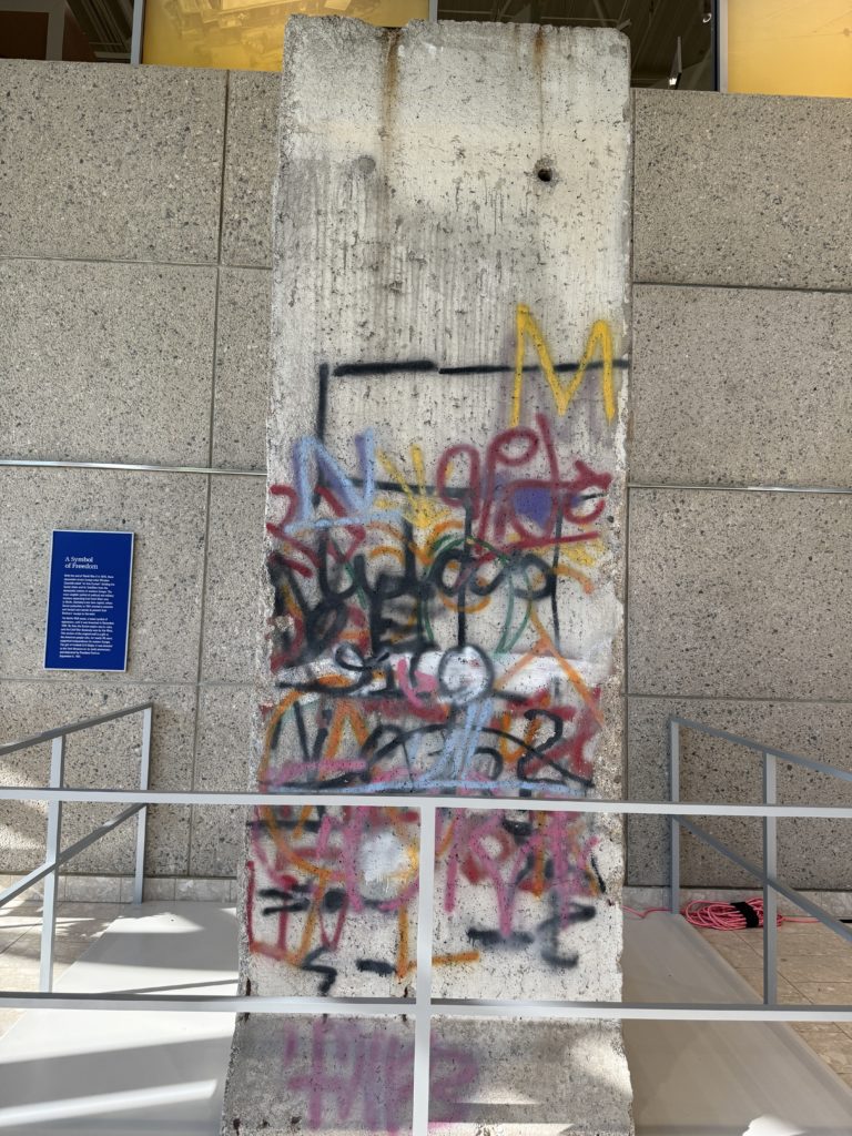 This is a statue of Gerald R. Ford outside his presidential library / museum. On the tour here we learned that Gerald Ford never really wanted to be president. When the presidency was thrust upon him at Nixon’s resignation, he accepted the presidency and was determined to serve with honor.This is another display outside of the Ford Presidential Library. Ford was a huge supporter of NASA and the space program.This is a hunk of the Berlin Wall, graffiti and all. Not sure why this is included in the Ford Library as the Berlin Wall didn’t come down until 1989, which was way after his presidency was over. But it is a cool display and close to my heart as I was stationed in Berlin while that wall was still standing.This is an exact replica of the Oval Office as it looked while President Ford was in office.This is an exact replica of the room where Ford held Cabinet meetings. Each person in the Cabinet had his assigned seat, as you can see by the labels on the table. Certain top level Press were allowed a seat at the table as well.And this is the final resting place for President Gerald R. Ford and First Lady Betty Ford. It’s on the grounds of the Presidential Library.Well, you know me and churches!! I just had to shoot a picture of the inside of this Catholic basilica, the Basilica of St. Adalbert. I am continually impressed with the beauty and detail of these places of worship.This is the dome of that same basilica. Just a view of downtown Grand Rapids. The river is the Grand River that flows through downtown.