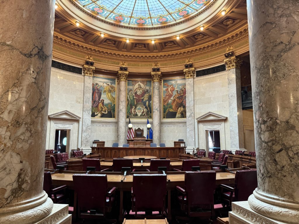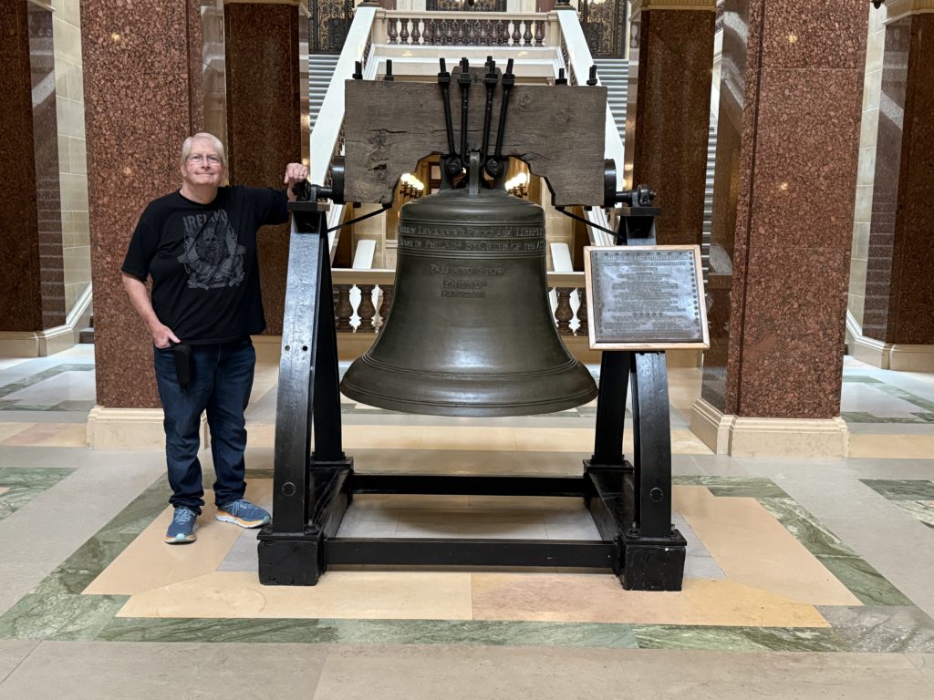 This is photo of the capitol building. Here is a fun fact: Wisconsin has the highest dome of any state capitol in the nation. It is even 16 feet and 2 inches taller than the U.S. capitol in Washington D.C. I think the statue on top gives them that extra height!!And here is that dome from the inside.The two photos above show two of the four glass tile mosaics located on the four arches surrounding the dome.There’s Trace mugging for the camera alongside a copy of the Liberty Bell in Philadelphia Pennsylvania. This bell was one of 55 made in France and given to each of the Unites States, the District of Columbia, and the U.S. territories in 1950. These bells are identical in size, weight and color to the original Liberty Bell, minus the crack.The Senate Chamber of the capitol building. There are 33 senators in the Wisconsin Senate. The majority party sits at the outer circle of desks while the minority party sits at the inner circle. The Senate president presides from the large desk at the front of the room.This is a view of the Assembly Chamber where the 99 representatives conduct their business. The Speaker of the Assembly sits at the desk in the front of the room and is shown in this photo.